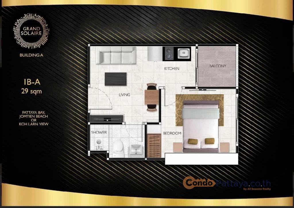 1 Bedroom (29 sq.m.) @ Grand Solaire Pattaya (situated in Pratumnak area). Listed for sale for price - 3 500 000 THB. This unit comes Fully furnished, equipped with Kitchen, Cooking hob, Microwave, Fridge, TV, Air-con, Internet, Cable TV, and registered in Foreigner name. This unit is situated on 23 floor and has nice Sea view, Pool view.