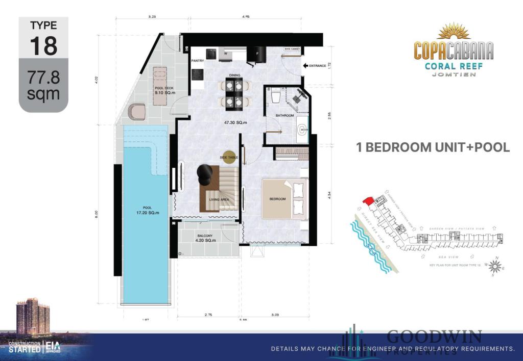 1 Bedroom (77.8 sq.m.) @ Copacabana Coral Reef (situated in Jomtien area). Listed for sale for price - 14 800 000 THB. This unit comes Fully furnished, equipped with Kitchen, Cooking hob, Microwave, Fridge, TV, Air-con, Internet, Cable TV, and registered in Foreigner name. This unit is situated on 44 floor and has nice Sea view.